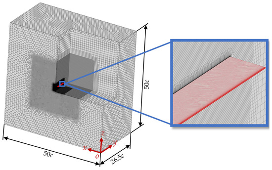 The computational domain and meshing are illustrated in Figure 3. The size of the computational domain is 50c × 26.5c × 50c, which ensures that the model wing is sufficiently far from the boundaries compared to other studies [13,38,39,40]. The boundary at y = 0 is a symmetric boundary condition, that is, , , , v = 0; while x = 0 is a pressure outlet boundary condition, that is, P = P0, , , , where denotes the standard atmospheric pressure. To minimize the influence of boundary conditions on the flow field, the remaining boundaries are set as velocity inlets along the negative x-axis direction [37,41], that is, , , , P = P0, where is the freestream velocity. The surface of the model wing is set as a no-slip and impermeable wall, that is, , , . The model wing is in the central region of the computational domain, with the wing root positioned 1.5c from the symmetry boundary. The Poly-Hexcore body mesh generation method was employed for meshing, enabling the co-nodal connection of hexahedral and polyhedral meshes to improve mesh quality. Additionally, the Body of Influence (BOI) method was used to refine the mesh around the model wing, ensuring a sufficiently fine mesh to capture flow variations while significantly reducing the number of cells and saving computational resources.