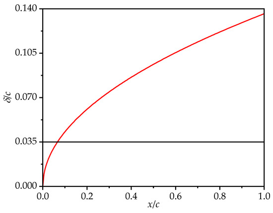 Since the Reynolds number in this study is Re = 1350 and a laminar flow model is employed, Figure 4 presents a comparison between the theoretical boundary layer thickness of the flat plate wing and the maximum corrugation amplitude (0.035c). The boundary layer thickness is calculated based on the Blasius solution. It can be observed that across most of the chordwise direction, the boundary layer thickness exceeds the maximum corrugation amplitude. Only in the region near the leading edge (approximately 0~0.1c) is the boundary layer thinner than the maximum corrugation amplitude, indicating that only the first peak of the leading-edge corrugation (B1) extends beyond the boundary layer. This further supports the appropriateness of using a laminar model for the simulation of the corrugated wing.