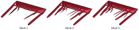 Furthermore, a mesh independence verification was conducted to minimize the influence of the mesh quantity on the simulation accuracy. Based on the fluid domain of a flat plate wing, three sets of computational domains with different mesh sizes were constructed by varying the mesh cell size in the BOI refinement zone and the thickness of the first-layer mesh. Mesh 1 has 2.1 million cells, with a first-layer mesh thickness of 0.002c; Mesh 2 has 5 million cells, with a first-layer mesh thickness of 0.001c; and Mesh 3 has 10 million cells, with a first-layer mesh thickness of 0.001c. The time-averaged lift coefficient () and drag coefficient () calculated for the three sets of meshes were evaluated, as shown in Table 3. For the flat plate wing at an AOA of = 15°, the relative error of the gradually decreased with increasing mesh density, with the maximum error declining from 4.06% to 2.55%. Notably, results from Mesh 2 and Mesh 3 exhibited negligible differences. Flow field structures, visualized via Q-criterion iso-surfaces after time-averaging, are shown in Figure 5. From the figure, it can be observed that Mesh 1 results deviate significantly from Meshes 2 and 3, whereas Mesh 2 shows only a minor difference compared to Mesh 3. To balance computational accuracy and efficiency, Mesh 2 was chosen for simulations in this study.