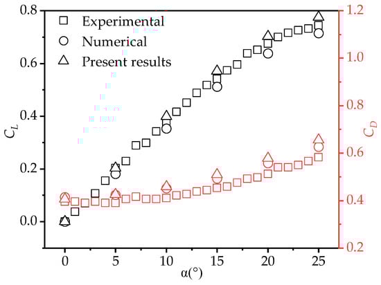 Lastly, the reliability of the numerical method was verified by comparing the simulation results with experimental data [42] and prior computational studies [20]. Using the same model as in Taira’s experiment [42], the lift coefficients () and drag coefficients () of the flat plate wing (AR = 2) were simulated under conditions of Re = 100 at various AOAs. As shown in Figure 6, the simulation results in this study exhibit a consistent trend with Taira’s experimental results [42] and Meng’s simulation results [20]. The calculated force coefficients at different AOAs also show good agreement. This indicates that the numerical method and mesh scale used are reliable and capable of accurately simulating the aerodynamic characteristics of gliding wings.