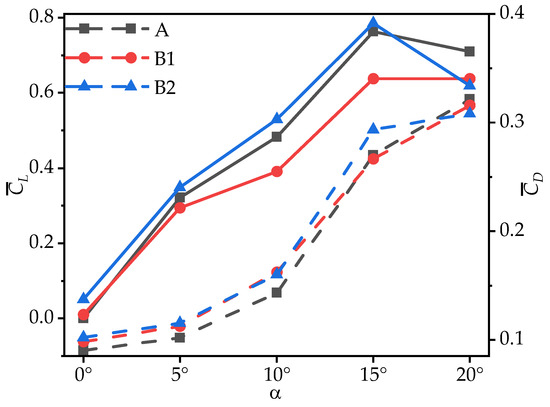 Variation in time-averaged lift coefficients (, solid lines) and drag coefficients (, dashed lines) of wings A, B1, and B2 with the angle of attack (AOA).