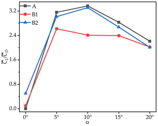 To comprehensively evaluate the aerodynamic performance of the model wings during gliding, Figure 8 presents the variation in the time-averaged lift-to-drag ratio () with the AOA for wings A, B1, and B2. As shown in Figure 8 and Table 4, all three wings exhibit a consistent trend in , which initially increases and then decreases as the AOA increases. At most AOAs, the of B1 is significantly lower than that of wing A, with a maximum reduction of 28.41%. For B2, the is slightly lower than that of wing A, with the difference ranging from 1.70% to 9.13%. Notably, the values of B1 and B2 exceed that of wing A only at = 0°. This is similar to the two-dimensional results of Xu [18], where corrugation structures located at the trailing edge exhibit higher values than those located at the leading edge.