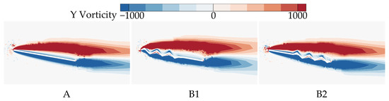 Time-averaged vorticity contours of wings A, B1, and B2 at 50% wingspan ( = 10°).