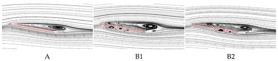 Time-averaged streamlines of wings A, B1, and B2 at 50% wingspan ( = 10°).