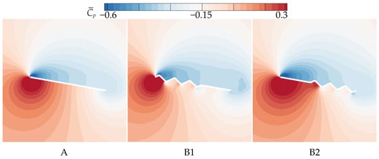 Time-averaged pressure coefficient contours of wings A, B1, and B2 at 50% wingspan ( = 10°).