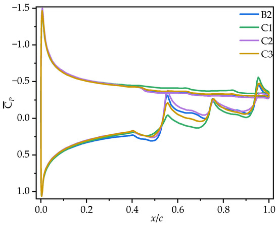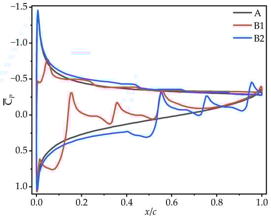 Time-averaged pressure coefficient curves of wings A, B1, and B2 at 50% wingspan ( = 10°).