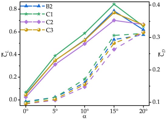 Figure 13 shows the time-averaged coefficients and of wings B2, C1, C2, and C3 at various AOAs. Table 5 provides the corresponding rates of change in the , , and time-averaged lift-to-drag ratios () of wings C1, C2, and C3 relative to B2. From Figure 13 and Table 5, it can be seen that all wings exhibit an initial increase, followed by a decrease in , peaking at = 15°. Within the range of = 0°~15°, C1 achieves the highest , surpassing B2 by 5.06~28.99%, though the rate of change relative to B2 gradually decreases as the AOA increases. C2 exhibits the lowest , while the values of for C3 are almost identical to those of B2. However, at = 20°, C1, C2, and C3 exhibit similar values, with C1, C2, and C3 showing a smaller stall, leading to a maximum improvement of 7.63% over B2.