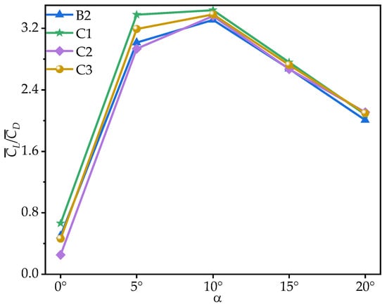 To further explore the effect of chordwise variation in trailing-edge corrugation on aerodynamic performance, Figure 14 presents the time-averaged lift-to-drag ratios () of corrugated wings B2, C1, C2, and C3 at various AOAs. As shown in Figure 14 and Table 5, all corrugated wings follow a rise-then-decline trend in , peaking at = 10°. C1 achieves the highest across all AOAs. At most angles, the values of C2 and C3 are nearly identical to those of B2. The greatest difference between the corrugated wings C1, C2, C3, and B2 occurs at = 0°, where C1 improves the gliding ratio by 31.96% compared to B2, while C2 and C3 reduce it by 49.77% and 8.03%, respectively.