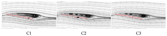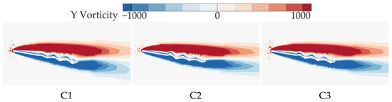 It can be concluded that C1 exhibits the best aerodynamic performance and the highest . In contrast, C2 shows the lowest at most AOAs, resulting in the poorest aerodynamic performance. This is similar to the conclusion in Xu’s study [18], where the corrugated structure is located in the middle of the airfoil. Comparing corrugated wings B2 and C3, it is evident that the , , and of B2 and C3 are similar at most AOAs. This suggests that the aerodynamic force differences of C1 and C2 are primarily due to the linear variation in the corrugation structures. To investigate the underlying reasons for the aerodynamic differences caused by chordwise variations in corrugation structures, the time-averaged vorticity contours and streamline diagrams at 50% wingspan for wings C1, C2, and C3 are compared at = 10°, where the aerodynamic force difference is most pronounced, as shown in Figure 15 and Figure 16.