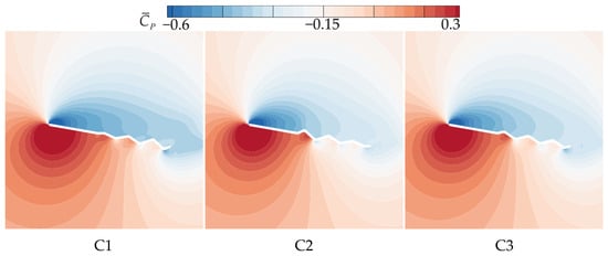 Time-averaged pressure coefficient contours of corrugated wings C1, C2, and C3 at 50% wingspan ( = 10°).
