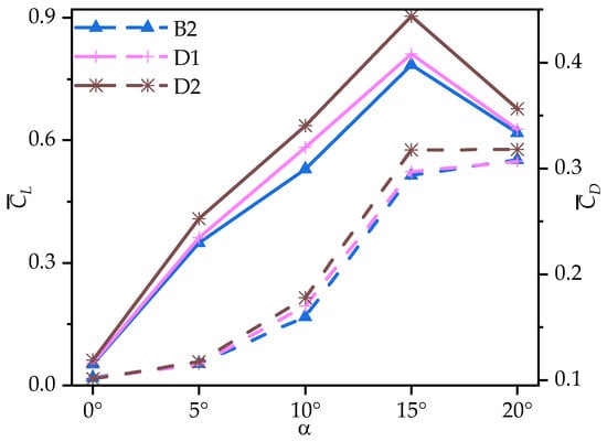 Variation in time-averaged lift coefficients (, solid lines) and drag coefficients (, dashed lines) of corrugated wings B2, D1, and D2 with the angle of attack (AOA).