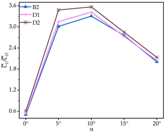 From the foregoing analysis, it can be inferred that the variation in the number of trailing-edge corrugations significantly enhances , while the change in is not notable at most AOAs. To further investigate the effect of the variation in the number of trailing-edge corrugations on aerodynamic performance, Figure 20 presents the time-averaged lift-to-drag ratios () of corrugated wings B2, D1, and D2 at various AOAs. From Figure 20 and Table 6, it can be observed that as the number of corrugations decreases, the improves for both D1 and D2 across all AOAs. Compared to B2, the of D1 is slightly improved, ranging from 1.91% to 6.26%, while D2 shows a substantial increase, with a maximum improvement of 20.91%.