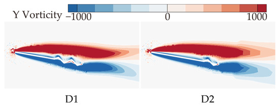 Time-averaged vorticity contours of corrugated wings D1 and D2 at 50% wingspan ( = 10°).
