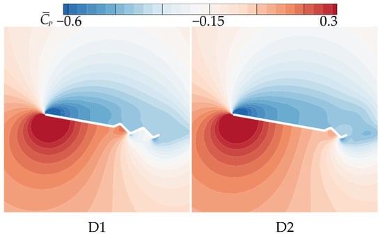 Time-averaged pressure coefficient contours of corrugated wings D1 and D2 at 50% wingspan ( = 10°).