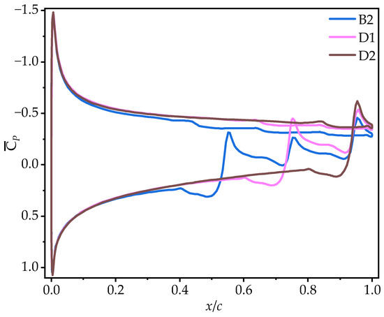 Based on B2, the previous section investigates the impact of chordwise variation in corrugation amplitude on aerodynamic performance. It is found that the wing with corrugation amplitude linearly increasing toward the trailing edge (C1) generates larger and more continuous vortices, which enhance negative pressure on the upper surface. On the lower surface, the strength and number of the vortices in the grooves are reduced, resulting in lower negative pressure peaks at the corrugations, making C1 have the optimal aerodynamic performance. This section further explores the effect of the number of corrugations on aerodynamic performance by comparing the corrugated wings B2, D1, and D2. As shown in Figure 1, D1 has two corrugations (four triangular waves), and D2 has one corrugation (two triangular waves).