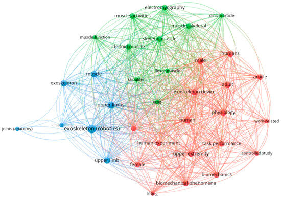 Bibliometric graph of articles related to the SCOPUS database that address the negative effects on the musculoskeletal system due to the interaction of using upper-limb exoskeletons. The graph was obtained with VOSviewer® version 1.6.20.