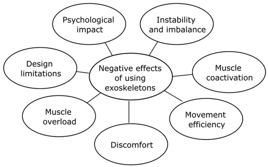 The use of upper-limb exoskeletons has shown significant benefits in reducing muscle load; however, adverse effects have also been evidenced that are important to consider for design, health, occupational safety, and ergonomics issues in developing these devices. This section describes the main negative effects evidenced in the scientific literature (Figure 5).