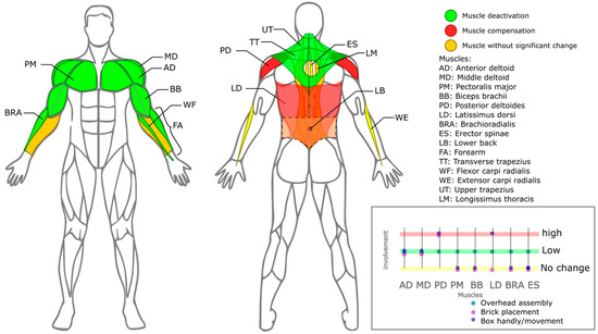 The findings of the above-cited studies on the activation and inactivation of muscles associated with the use of upper-limb exoskeletons are illustrated in Figure 6.