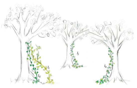 - Obtaining sunlight for growth. For ivy in nature, quickly finding a surface to attach to is crucial. The movement towards the light source is modeled by Equations (6)–(8). In the proposed algorithm, this behavior is simulated by the individual in the population, selecting its closest and most optimal neighbor (based on the value of the fitness function) as a reference for self-improvement, as shown in Figure 2.where is a vector, with each component being the absolute value of the corresponding component in the vector .