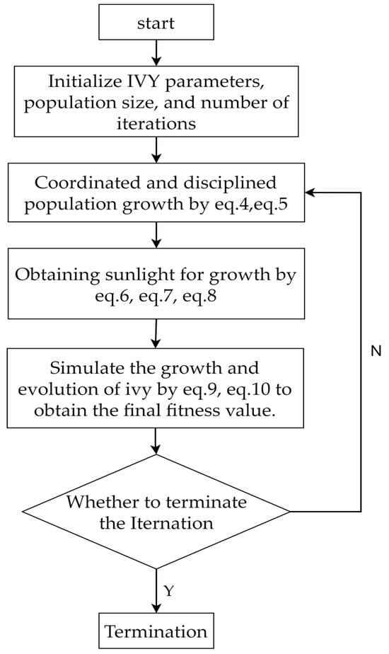 - Growth and evolution of ivy. After the member navigates the search space globally to reach its nearest and most significant neighbor , it enters a phase where strives to directly follow the optimal member in the population. This stage aligns with the pursuit of an improved optimal solution in the vicinity of , as depicted in Equations (9) and (10).The flowchart of the ivy algorithm is shown in Figure 3.