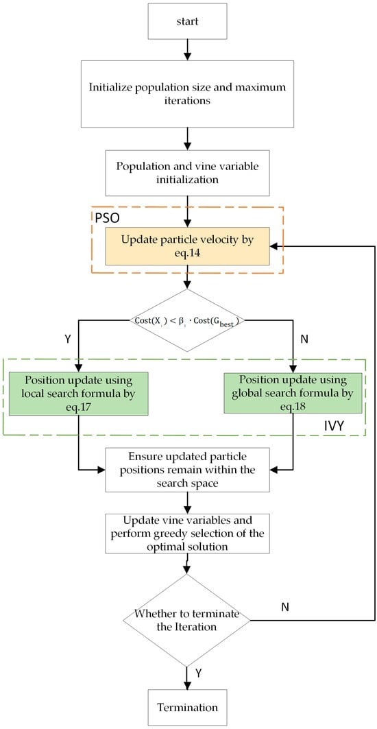 Through PSO-guided global movement and ivy-inspired local perturbations, IVYPSO forms a complementary hybrid search system. The use of ivy growth variables enhances the adaptability and solution refinement, particularly in rugged or complex landscapes. The implementation process of IVYPSO is illustrated in Figure 4 and Algorithm 1.