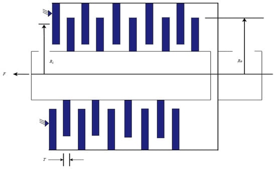 Figure 8 illustrates the multiple-disk clutch brake design problem, a classic engineering optimization issue that is commonly encountered in automation equipment, mechanical transmission systems, and the automotive industry []. This problem involves optimizing the design of the clutch and brake system to minimize the stopping time of the brake while ensuring high operational efficiency and stability. Such design problems are highly relevant to real-world engineering scenarios, where the balance between performance, efficiency, and reliability is critical. By addressing this problem, the algorithm’s ability to handle practical engineering challenges and improve the overall system design is demonstrated, reflecting its applicability in real-world applications. This problem involves five decision variables: the inner radius in millimeters, outer radius in millimeters, disk thickness in millimeters, driving force , and number of friction surfaces .