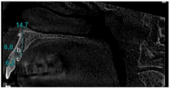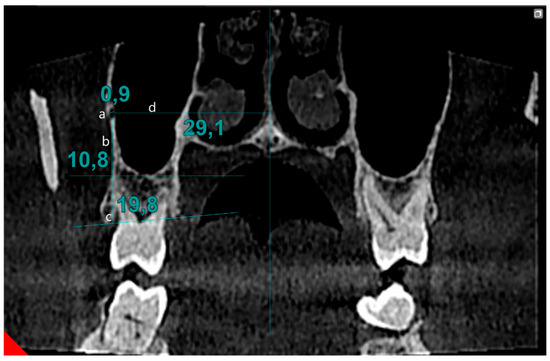 Evaluation of CS parameters: (a) distance to nasal cavity floor from CS, (b) distance to buccal bone from CS, (c) distance to alveolar crest from CS.