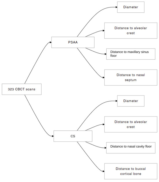 Evaluation of PSAA parameters: (a) diameter of PSAA, (b) distance of PSAA from sinus floor, (c) distance of PSAA from alveolar crest, (d) distance of PSAA from midline.