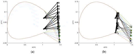 The results of the four-bar linkage synthesis design for the VCM are shown in Figure 3 and Table 2. The successful run number in the table is the optimization run, during which a feasible linkage was found, ranging from 16 to 30. The unsuccessful run indicates the worst performance. The results also include the mean objective function values from the successful runs (mean), the successful run result with the highest error (max), the best feasible result (min), and the standard deviation (std). The descriptive statistics (mean, max, min, and std) show the performance of our proposed technique, which provides a unique solution to this design problem with a narrow standard deviation and the remaining statistics. Figure 3a shows one of the worst mechanisms, while Figure 3b shows the best mechanism (min). The figures were created after 30 runs, including the worst and best runs and their descriptive statistics. This means that the worst result is not included in the design space, while the best result is. The best result yielded an error of 0.000631 in counterclockwise rotation, which is higher than in the worst case (0.00005546 in clockwise rotation). Figure 3b shows that the best result outperforms the worst case because the VCM achieved the best fit with the trailing edge deflection. The dimensions of the link length in Table 2 show that the best results were found for the double-rocker type because the shortest link (r3) is opposite to the ground (r1). In contrast, the worst were obtained for the changed point type. This implies that Grashof’s double-rocker can be designed to meet the requirements. Given the results, the crank sequence of the best and worst results shows that the technique can perform well in tracking its crank sequence. The technique (the path-repairing technique) and the power of the optimizer (TLBO-DA) used in this study were sourced from a previous work []. The results confirm that this design satisfies Grashof’s Criterion and ensures that the linkage can achieve the continuous motion required for smooth camber transitions. Furthermore, the results confirm that the VCW can morph efficiently into different aerodynamic profiles during flight, as presented in the next section.