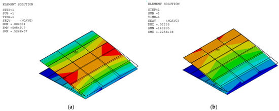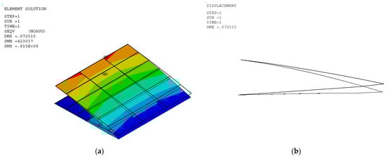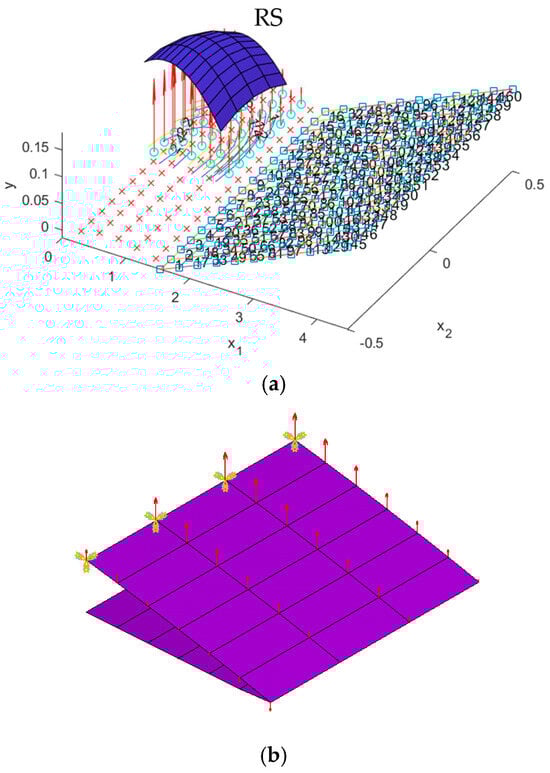 The stress and displacement results for the variable camber wing were obtained by setting the fixed-boundary condition at the root of the upper skin. The root of the bottom skin was only constrained in the y coordinate, as shown in Figure 1, and the displacement was applied due to the desired deflection angle and aerodynamic load in the FEA model. Aerodynamic lifting can be transferred via the VLM at the vertex points to FEA nodes in the form of the response surface technique (Section 2.5.1). The VLM was used to simulate the UAV’s straight wing section, which is 0.5 m in span and 1.472 m in chord length, with a 2412 airfoil profile. The model was placed with quadrilateral panels 5 and 8 chordwise and spanwise for the wing body, respectively, while its wake was 10 boxes chordwise, as shown in Figure 4a. The angle of attack in each simulation was used in the same manner as the angle of deflection of the tailing edge. The aircraft’s speed or free stream velocity in this simulation was 40 m/s. The quality of a regression function can be measured in the form of R2 and R2adj. The R2 and R2adj of the present regression function were 0.9319 and 0.9219, respectively. The RS (Figure 4a) and aerodynamic load on the FEA (Figure 4b) shape aligned with aerodynamic theory in terms of its elliptical shape [], meaning that the lift force function can be used to generate the lifting force applied to the FEA model with good precision. The response surface (RS) is presented in Figure 4a.