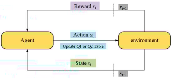 The Q-learning model consists of five fundamental components: the agent, environment, action, state, and reward. Its operational procedure can be succinctly described as a cyclical interaction of state transition, action selection mechanism, and reward feedback. In traditional Q-learning, a single Q-table is employed to store the estimated values of state–action pairs. However, this approach often suffers from issues such as overestimation bias and limited exploration capacity. To mitigate these limitations, double Q-learning introduces two independent Q-tables, each of which is updated independently. This dual-table framework significantly reduces the estimation bias inherent in the single-table approach and enables a more balanced, robust evaluation of the learned policy.