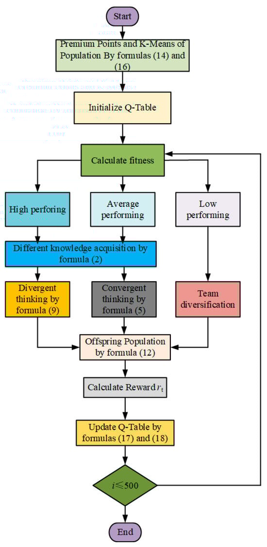 By integrating the probability distributions and maximum values derived from two independent Q-tables, the double Q-learning mechanism enables more balanced action selection between exploration and exploitation. Within the DQDCS algorithm, this dual-Q-table framework effectively mitigates the estimation bias commonly associated with single-Q-table implementations and facilitates more comprehensive policy evaluation, thereby enhancing the algorithm’s global search capability. Specifically, double Q-learning selects the optimal action based on the current state, which subsequently guides population updates. This approach allows for broader exploration during the early stages of optimization while gradually shifting toward refined exploitation of promising regions in the later stages. As such, the algorithm achieves accelerated convergence without compromising solution quality. A flowchart of the DQDCS algorithm is illustrated in Figure 2.