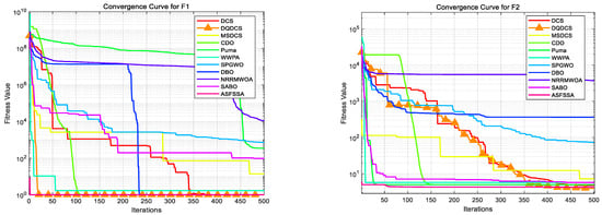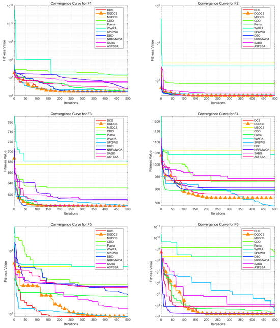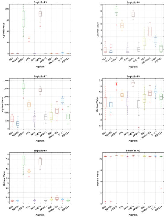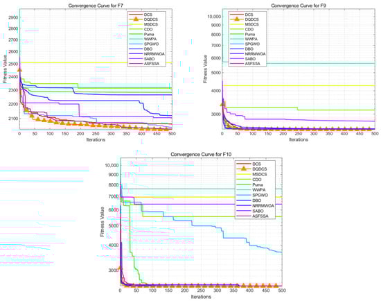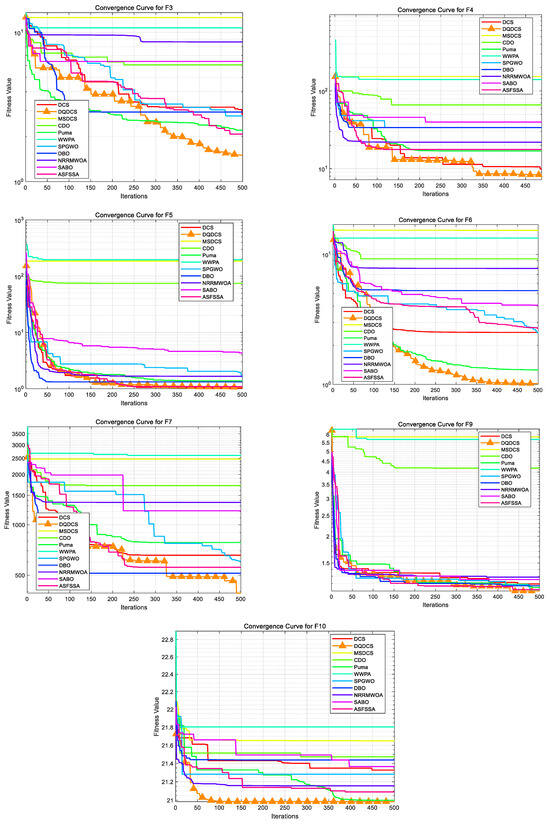 As shown in the statistical results in Table 2, the proposed DQDCS algorithm consistently achieves the best values on all functions from F1 to F10. Moreover, it obtains the best mean performance on F3–F10 compared to other competing algorithms. In addition, the DQDCS achieves the smallest standard deviation on functions F3, F5, F6, F8, and F9, demonstrating superior robustness. These findings indicate that DQDCS not only offers stable performance but also exhibits highly competitive exploration capability among the compared algorithms.