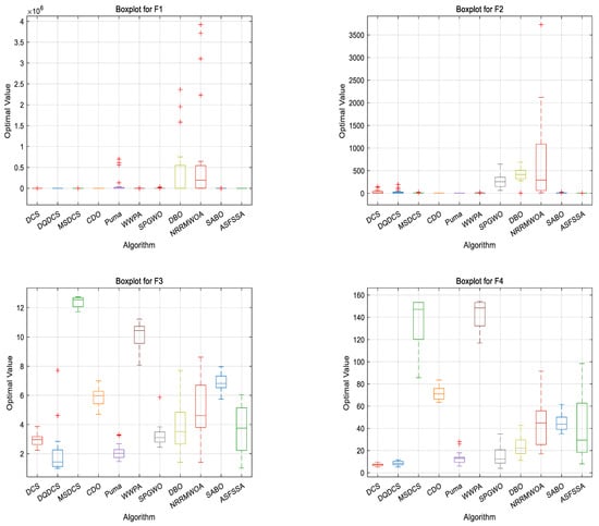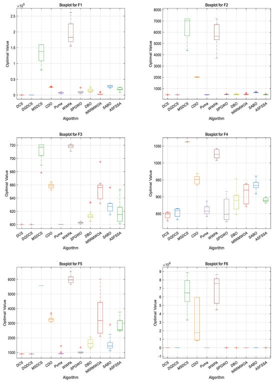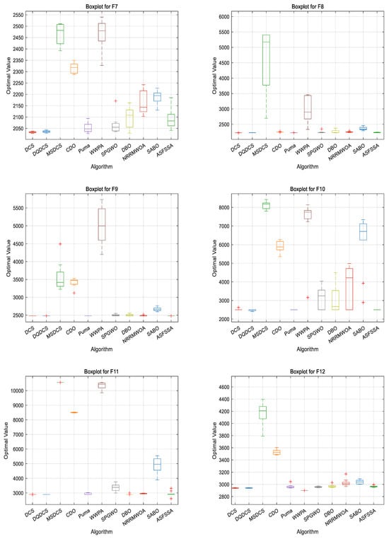 In order to compare the performance of different algorithms, a boxplot evaluation based on the CEC2022 benchmark functions was drawn to assess and compare the algorithms. As shown in Figure 6, the DQDCS algorithm exhibits no outliers across functions F1 to F12, indicating superior robustness compared to the other algorithms. Furthermore, the boxplots for functions F1 to F3 and F5 to F12 are relatively flat, suggesting that the DQDCS algorithm demonstrates stable data behavior.