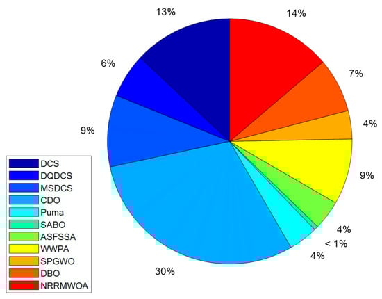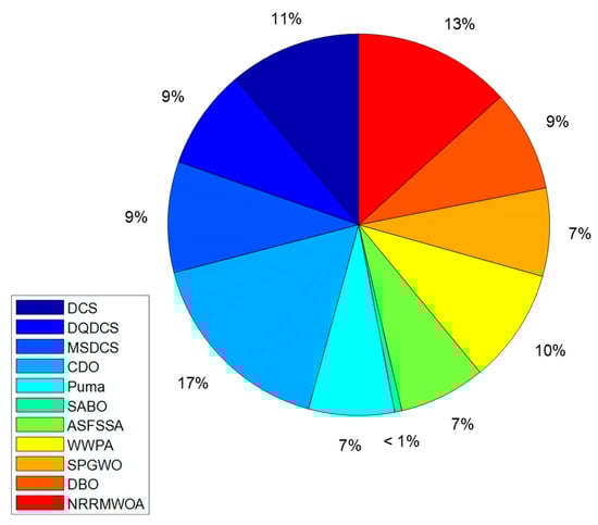 Moreover, the DQDCS algorithm also ranks third in CPU running time for solving the SOPWM (synchronous optimal pulse width modulation) problem in a three-level inverter, as depicted in Figure 10. The reduced CPU running time contributes to lower energy consumption, particularly in large-scale computations, resulting in savings in both electricity and hardware resources.