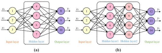 Multilayer perceptron (MLP) is one type of feedforward neural network (FNN), which has shown the powerful ability to solve nonlinear problems [22]. As shown in Figure 1, two MLP models are presented, which have structures of 3-4-3 and 3-4-4-3, respectively. The input information starts at the input layer and passes layer by layer until it reaches the output layer. In general, there is one input layer, one output layer, and one or more hidden layers in an MLP model, and each layer has multiple nodes. These nodes in the hidden or output layers are used to perform the neural network computation. Like other neural networks, the weights between nodes and the biases of nodes are the key parameters that need to be optimized.