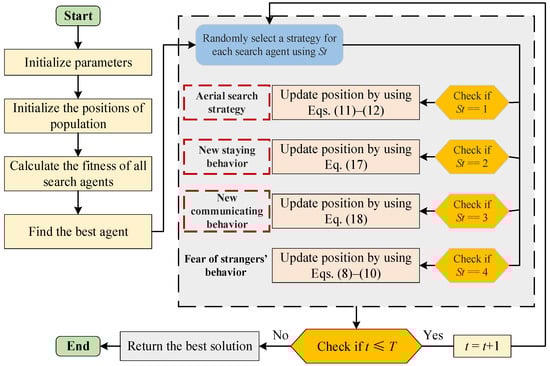 The Pseudocode of IPO is given in Algorithm 1, and the flowchart of IPO is shown in Figure 2. When the IPO begins the optimizing process, the positions of the population are first initialized and the optimal individual is determined. Then, the algorithm enters a cyclic iterative process, and each individual performs a certain behavior according to the parameter St, including aerial search strategy, modified staying behavior, improved communicating behavior, and fear of strangers’ behavior. When the number of algorithm iterations reaches the terminating condition, the loop exits and outputs the found optimal solution.