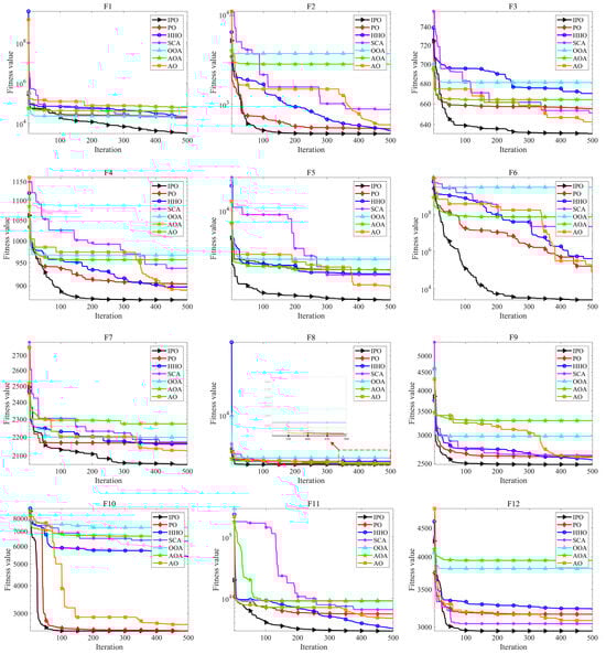 Table 6 shows the test results of mean, best, worst, and standard deviation for all algorithms. The best results of mean values for these test functions are marked in bold. It can be seen from Table 6 that the IPO algorithm outperforms the comparison algorithms in test functions F1, F2, F5, F6, F9, F1, and F12, which shows a strong competitive performance. It is also noted that AO obtains the best mean values on F3, F4, F7, and F8, and PO wins on F10. Overall, the proposed IPO displays obviously better performance than other algorithms.