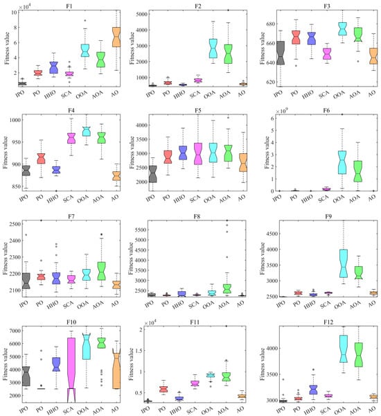 Figure 4 presents the boxplots of all algorithms on each CEC2022 test function. It is shown that the boxplots of IPO on F1, F6, F9, F11, and F12 are noticeably narrower than other algorithms, indicating its good stability when solving these problems. In addition, the medians of boxplots for IPO on F1, F5, F9, F11, and F12 are also significantly lower than other methods, showing better accuracy. In other cases, IPO also presents competitive results. Thus, IPO has the merits for solving these optimization problems.