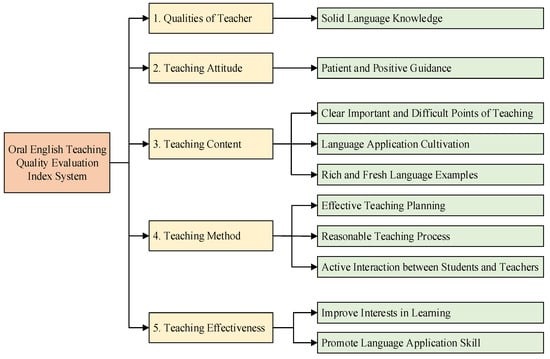 For better evaluating the oral English teaching quality, the indexes of oral English teaching quality evaluation problem are selected according to the works in [19]. The index system is constructed as shown in Figure 5, which has five first-grade indexes: qualities of teacher, teaching attitude, teaching content, teaching method, and teaching effectiveness. In each first-grade index, there are one or more second-grade indexes. These elements play a leading role in the oral English teaching evaluation and ensure the scientific and reasonable teaching quality evaluation system.