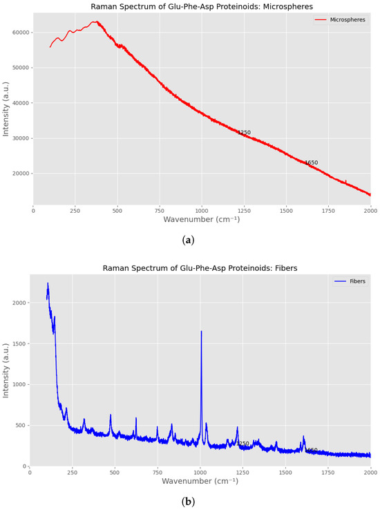 Raman spectroscopy is a strong tool for studying proteinoids. It helps us to understand their molecular structure and interactions. This method gives detailed insights into their vibrational modes and shapes, as shown by Zhu et al. [41]. Zhu et al. analyzed the Raman spectra of 18 amino acids and their solutions. The spectra of solids are usually sharper and more complex than those in solution. This difference comes from how molecules interact in crystalline structures [41]. This principle shows in the Raman spectra of Glu-Phe-Asp proteinoids in Figure 3. It includes spectra for microspheres, fibers, and their composite. The microspheres’ spectrum (Figure 3a) shows wider and stronger peaks. This is especially true at 1250 cm−1 (amide III) and 1650 cm−1 (amide I). These findings suggest a greater level of molecular disorder. This matches Zhu et al.’s [41] finding. They noted that solution-phase spectra usually have broader bands. This happens because of random intermolecular forces and strong motions in liquids [41]. The wider peaks in microspheres might show a more disordered structure. This could be because their spherical shape increases surface interactions and variability, much like how amino acids, such as aspartic acid and glutamic acid, act in solution. Their low solubility causes weak Raman signals and fluorescence interference [41].