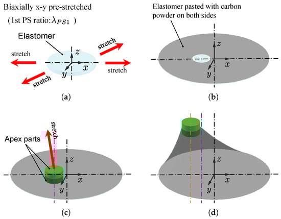 Figure 1 shows the fabrication procedure of an oblique cone DEA. First, the elastomer, VHB Y-4905J (3M, USA), was biaxially pre-stretched in the planar direction and attached to the edge of a hole of a certain radius in the lower base frame part. Then, carbon powder as a flexible electrode was pasted to both surfaces of the elastomer, except where the apex parts were to be connected. Next, the apex part of the oblique cone was connected to the elastomer. Finally, the oblique cone shape was fabricated by lifting the apex part obliquely upward. In the fabrication process of the oblique cone DEA, the elastomer was pre-stretched twice: initially in a planar direction, and subsequently as the apex was lifted upward at an oblique angle. In this paper, we refer to them as the first-stage pre-stretch (1st PS) and the second-stage pre-stretch (2nd PS), respectively. Introducing two offsets during the fabrication of states (c) and (d) in Figure 1, along with diagonally lifting the apex upwards in the 2nd PS to ensure a consistent resilient force across the generatrix, helps reduce the necking of the generatrix in the oblique cone DEA. This prevents non-uniform necking on the circumference, thereby minimizing modeling error and the deterioration of the driving performance.