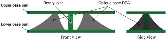 Next, we explain the structure of the oblique cone DEA drive module illustrated in Figure 2. The module consists of two oblique cone DEAs that mimic white muscle and are in an antagonistic state. The upper and lower parts mimic fascia, and the axis of rotation mimics a joint. The apex part of the oblique cone DEA attached to the lower base part is lifted to form the oblique cone and fixed to the upper base part. This allows the DEA to maintain its form of oblique cone shape. The upper base part holds the lower base frame part of the next module. In other words, the DEA of the next module is attached to the upper base part of the module. By stacking and connecting these modules together, a vertebrate structure robot can be formed.