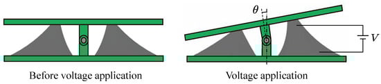 Figure 3 shows the driving principle of the drive module. Initially, the left and right oblique cone DEAs are antagonistic to each other across the axis of rotation. When voltage is applied to one side of the DEA, the resilience of the DEA on the applied side decreases due to Maxwell stress. This causes the left and right antagonism to collapse, and the module bends until the left and right DEAs’ antagonism is balanced again. When the application of voltage is stopped, the module returns to its initial state.