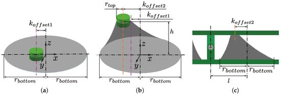 Figure 4 shows the definition of the design parameters of the drive module. The module has eight parameters: the radius of the top and bottom circles of the oblique cone, [mm] and [mm], respectively; the distance between the center axes of the apex part and the bottom circle in the state before and after 2nd PS, [mm] and [mm], respectively; the horizontal distance between the center axis of the oblique cone module and the center axis of the bottom circle l [mm]; the height of the oblique cone DEA, h [mm]; the initial thickness of the elastomer, [mm]; and the 1st PS ratio, .
