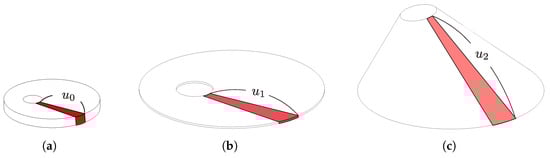 As shown in Figure 5, the oblique cone DEA is divided into infinitesimal areas, and we focus on its deformation process. , , and are defined for the lengths of the generatrix of the infinitesimal areas before the 1st PS, before the 2nd PS, and in the module bending state, respectively.