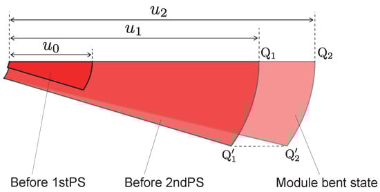 A comparison of infinitesimal areas before 1st PS and 2nd PS and in the module bending state is shown in Figure 7. The stretching ratio in the direction of the generatrix, , is given by