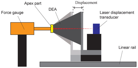 To identify the material constants of DEA, we conducted the tensile tests using a fabricated cone DEA. Equation (10) is used to determine the hyperelastic material parameters from the measured forces and displacements. Figure 8 illustrates the tensile test method. A force gauge (FGP-0.5, Nidec, Kyoto, Japan) was used to measure force, and a laser displacement transducer (IL-S100, KEYENCE, Osaka, Japan) was used to measure displacement. The cone DEA was placed horizontally on a motorized linear stage (SGAMH26-200, SIGMA KOKI, Saitama, Japan) with its central axis coinciding with the measurement axis of the force gauge. The linear stage was controlled at a constant speed of 0.05 mm/s with a cone height ranging from 2 mm to 37 mm. In this experiment, the DEA was not applied to voltage. Measured data acquisition from the force gauge and laser sensor, as well as control of the linear stage, were all implemented in LabVIEW.