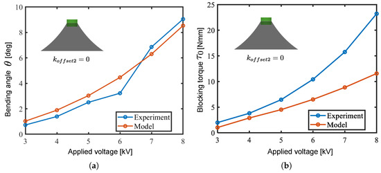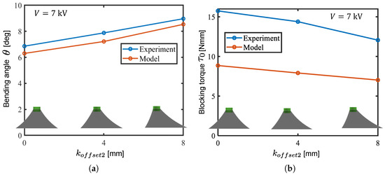 Output comparison between the models and experiments with varied . (a) Bending angle; (b) blocking torque.
