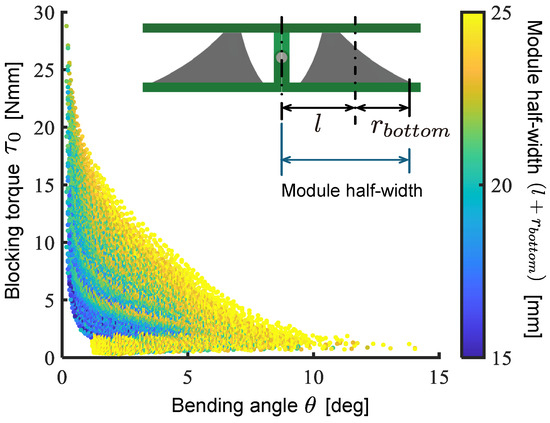Figure 13 shows a plot illustrating the relationship between the maximum bending angle and blocking torque of the modules based on the results of calculating all possible combinations. The results indicate a trade-off relationship between the bending angle and blocking torque of the drive module, which aligns with the module characteristics suggested in our previous work. Furthermore, it is clear that a smaller module width leads to a reduction in both the bending angle and the blocking torque.